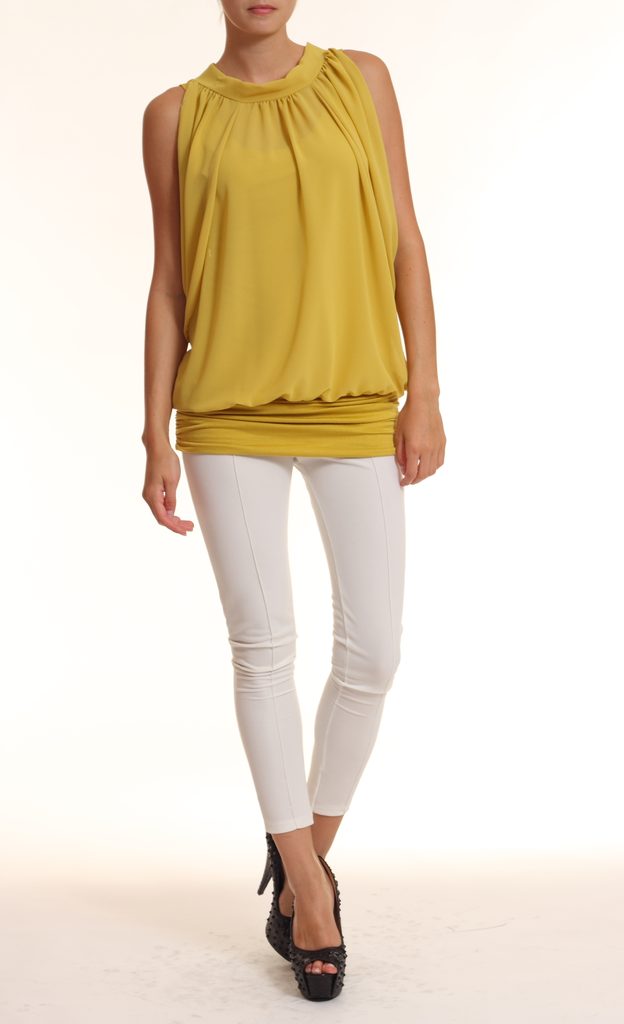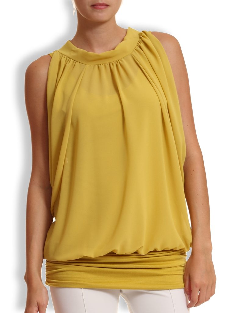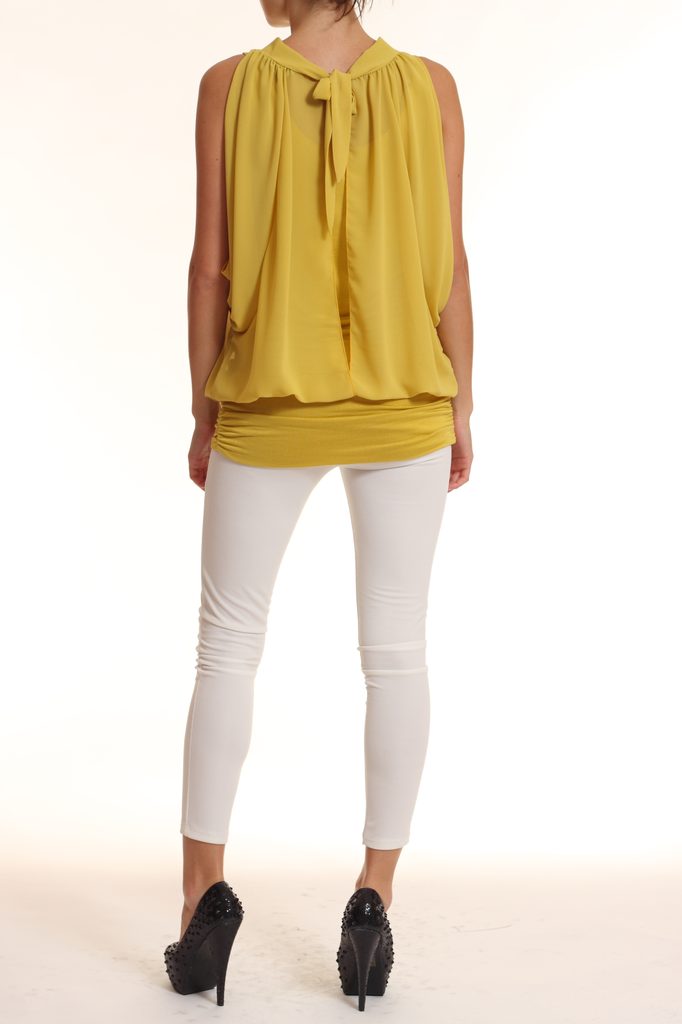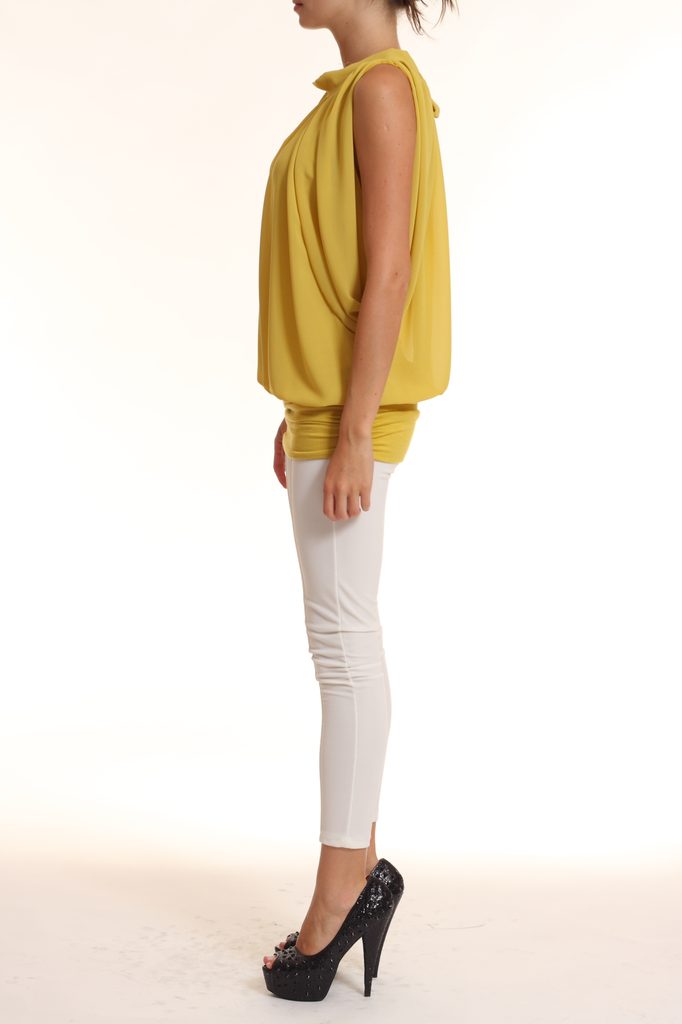 Dámský letní top ve žluté barvě. Top nemá rukávy, zavazování má za krkem. Vnitřní část je upnutá na těle, vnější část je volnějšího střihu. V dolní části je široký lem, který dodá topu elegantnost. Vhodné k jeanám či úzkým kalhotám, do práce, do města i na párty.
