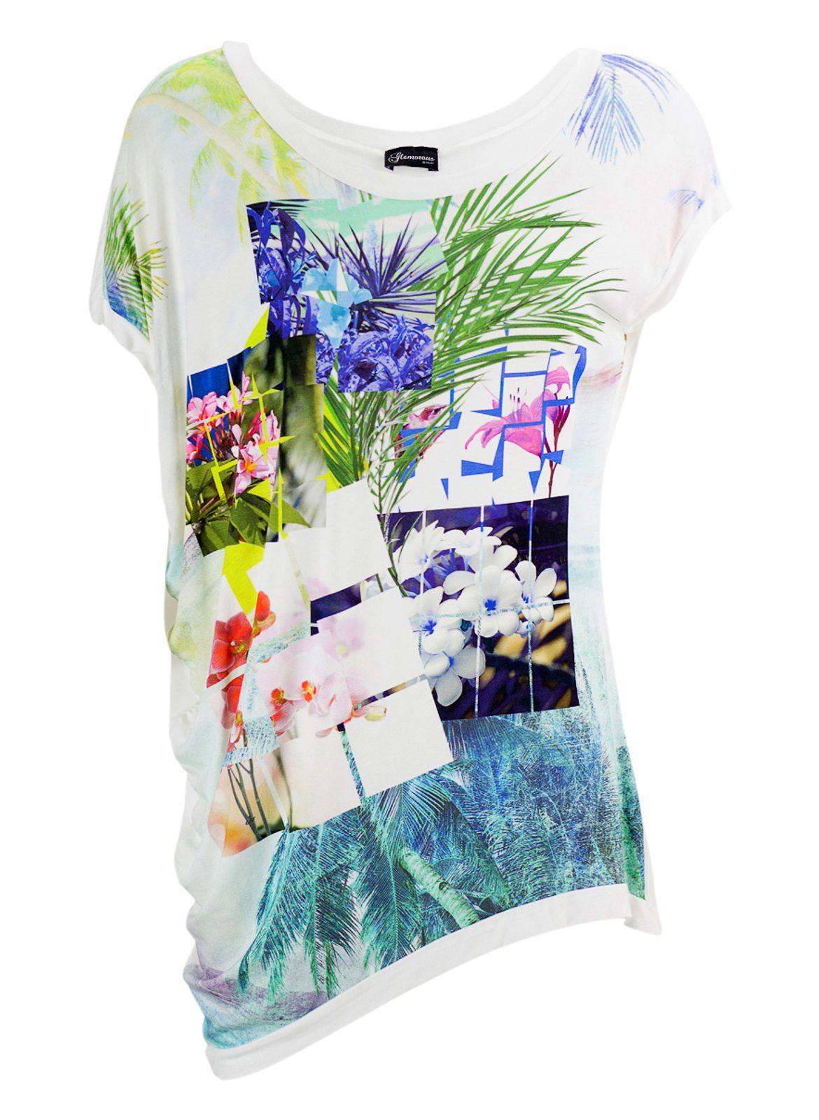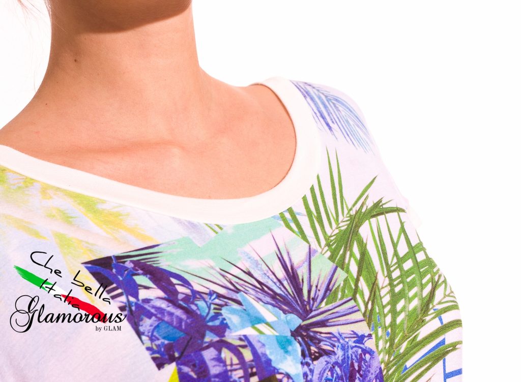 Dámský letní top v bílé barvě s motivem. Top má kulatý výstřih, krátké rukávy a asymetrický střih. Na přední straně jsou motivem obrazce a barevné květiny. Zadní část je celá bílá. Top zvýrazňuje lem u výstřihu, rukávů a v dolní části. Vhodné k legínám či úzkým jeanám, do města i pro volný čas.