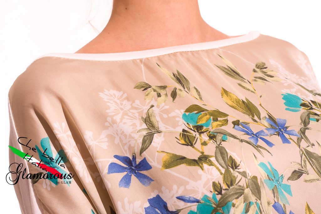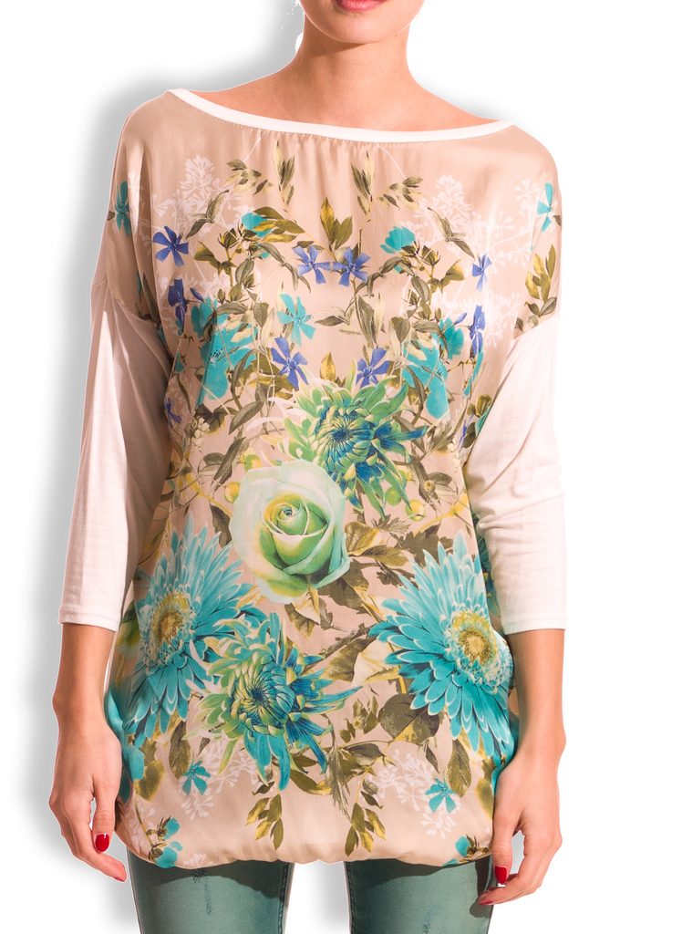 Dámský tunika v béžové barvě. Tunika má dlouhé rukávy, kulatý výstřih. Přední část je z příjemného saténového materiálu, na které jsou tyrkysové květiny na béžovém podkladu. Lem kolem krku a v dolní části je béžový. Zadní část je celá béžová. Vhodné k legínám či úzkým jeanám, do práce i do města.