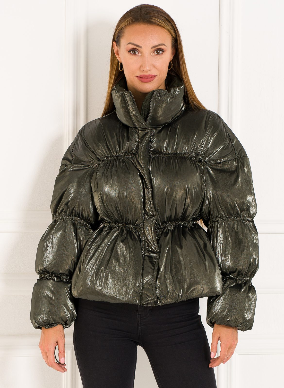 Dámská krátká oversize bunda metalická v zelené barvě. Bunda je krátká a má oversize střih. Jednotlivé části bundy lze stáhnout. Po stranách má bunda kapsy. Bunda skvěle sedí na těle a zaujme svým střihem. Hodí se ke každodennímu nošení do práce i do města.
