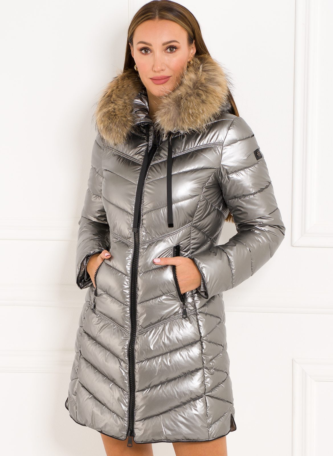 Dámská zimní bunda s pravou kožešinou ve stříbrné barvě. Bunda má 3/4 délku a zapínání na zip. Po straně má bunda kapsy na zip. Kolem kapuce je bunda doplněna pravým mývalovcem. Bunda se hodí se ke každodennímu nošení.