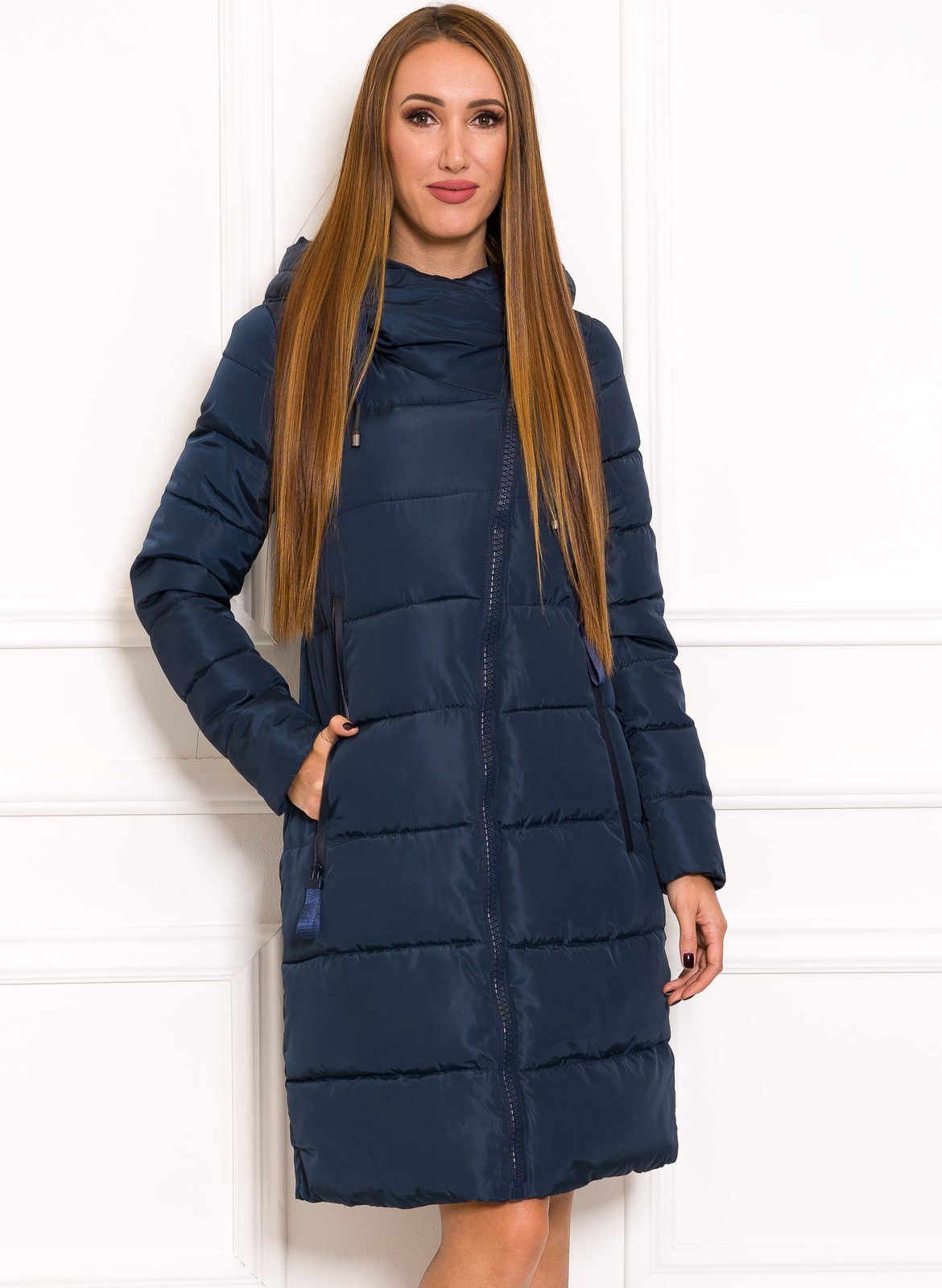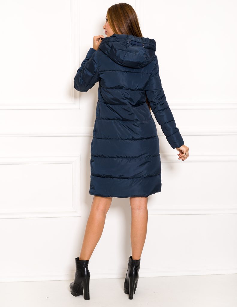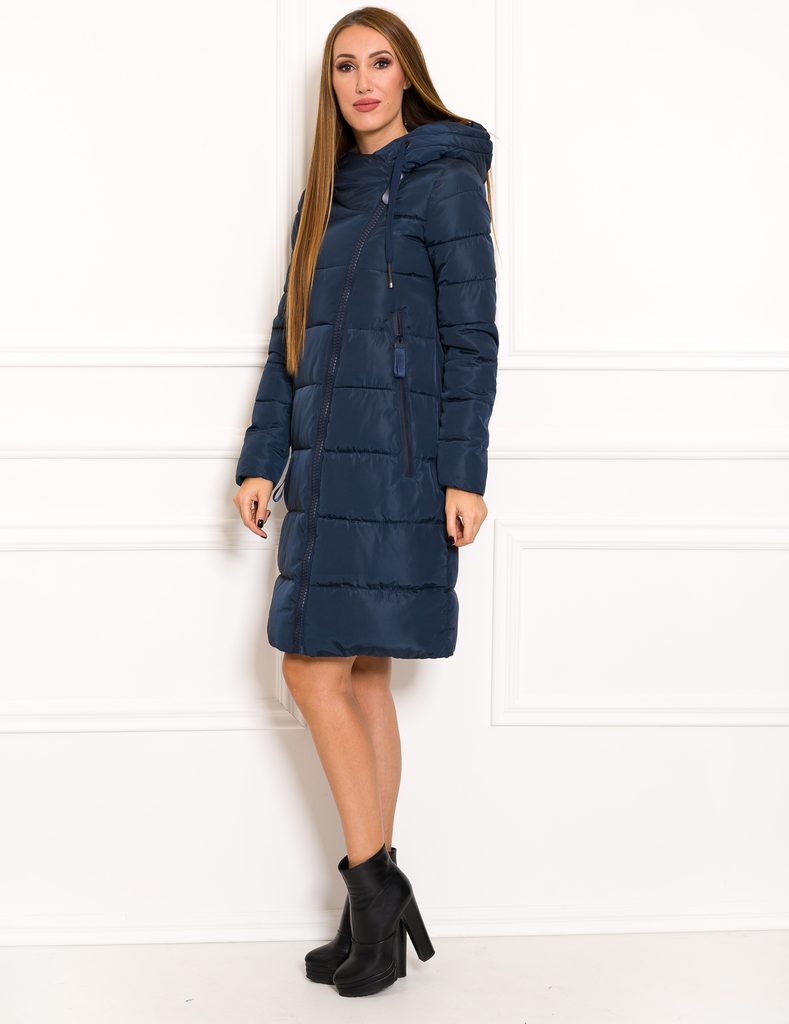 Dámská zimní oversize bunda v tmavě modré barvě. Bunda je volnejšího oversize střihu a má kapucu. Zapínání je řešeno na asymetrický zip. Po stranách má bunda kapsy, které jsou na zip. Bunda je velmi zajímavá svým střihem. Hodí se ke každodennímu nošení do práce i do města.