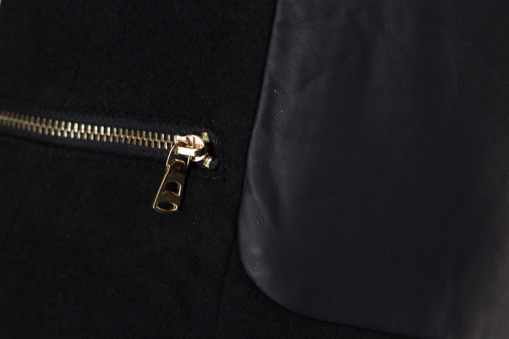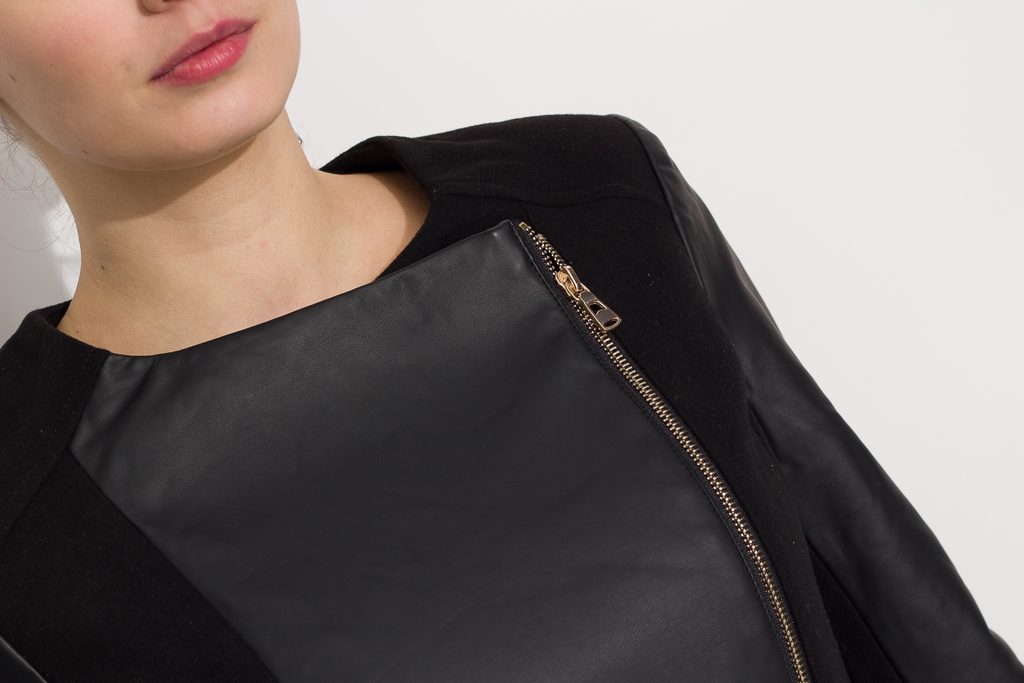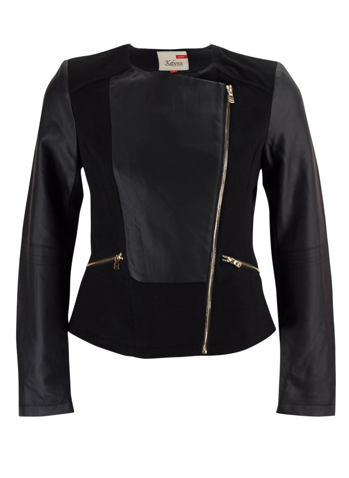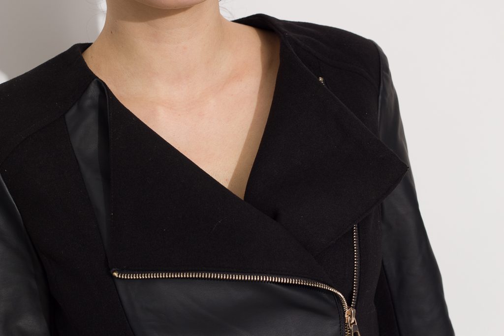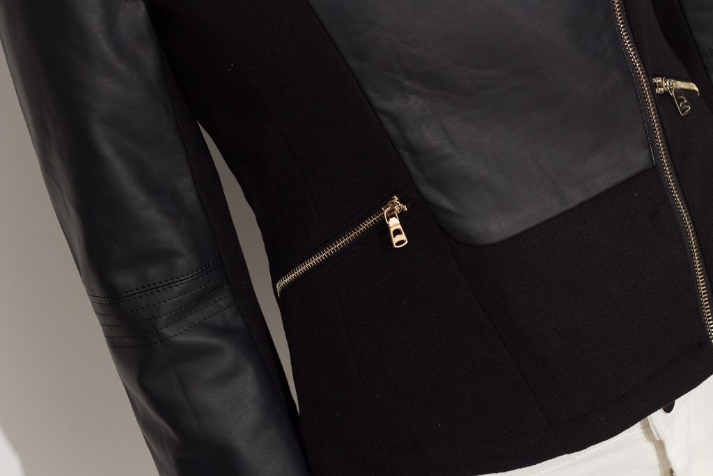 Dámská jarní krátká bundička v černé barvě. Bundička je z části bavlněná, rukávy a přední část je doplněna z černé koženky. Zapínání je ušité k levé straně a na zlatý zip. Bundička má vpředu dvě kapsičky, které jsou taky na zlaté zipy. Velmi elegantní, působí mladistvě. Vhodná k legínám, jeanám či k šatům. Lze jí vzít do města i pro volný čas.